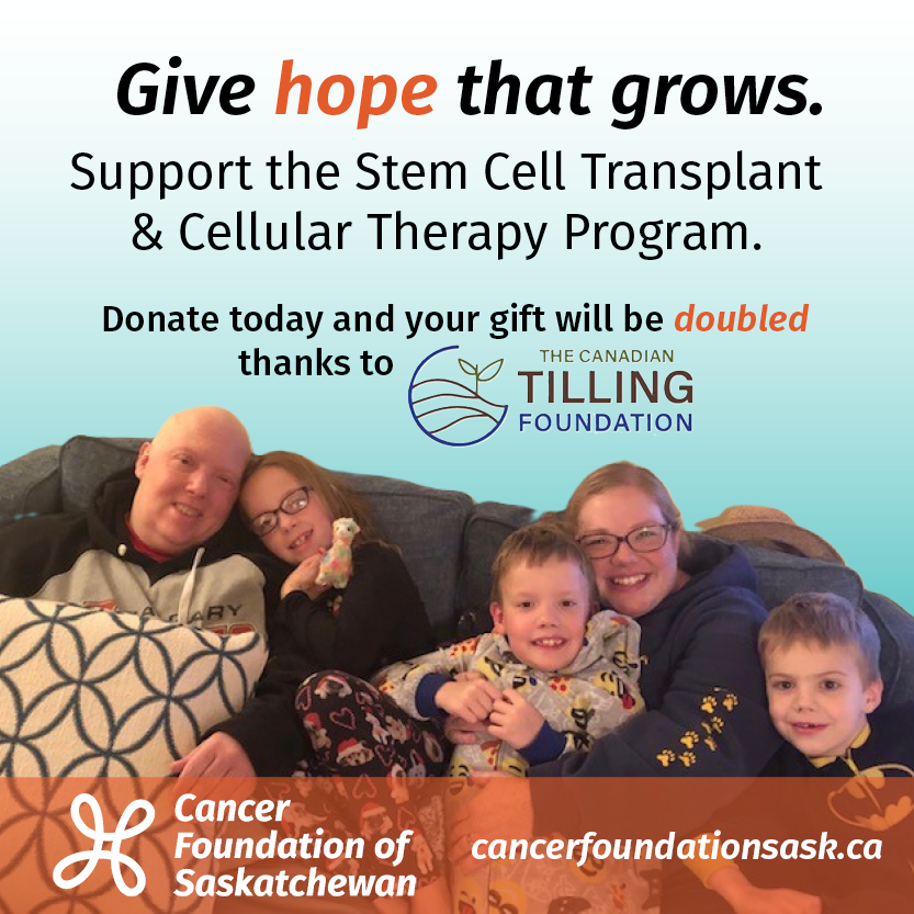 The Canadian Tilling Foundation believes that stem cell patients and their families heal best when they can focus on their health and not worry about their families at home. Access to treatment should not be a financial burden, and that is why they’ve chosen to provide a generous $50,000 matching gift to the Cancer Foundation of Saskatchewan – doubling the impact of every donation you make today.