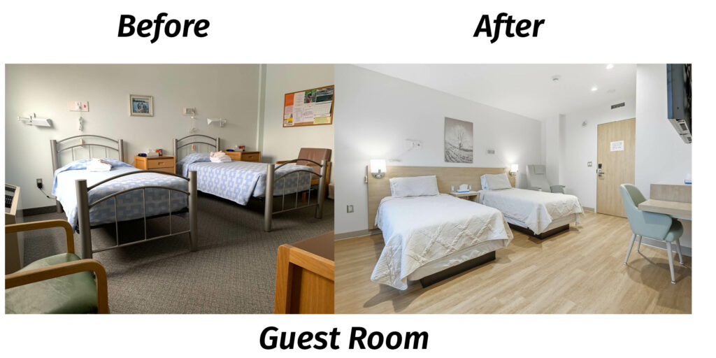 All 18 rooms have been fully renovated and now include new beds, bedding, furniture, artwork, cable TV, vinyl flooring, window shades and blackout blinds, lighting and keycard access. Updates were also made to the private washroom in each room so that each guest will now have a walk-in shower with a built-in shower bench or bathtub option, which improves accessibility and patient safety. The lodge also now has a guest room option that is completely barrier free.