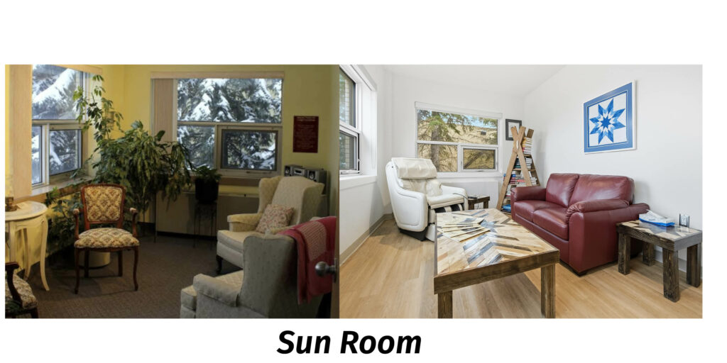 All 18 rooms have been fully renovated and now include new beds, bedding, furniture, artwork, cable TV, vinyl flooring, window shades and blackout blinds, lighting and keycard access. Updates were also made to the private washroom in each room so that each guest will now have a walk-in shower with a built-in shower bench or bathtub option, which improves accessibility and patient safety. The lodge also now has a guest room option that is completely barrier free.
